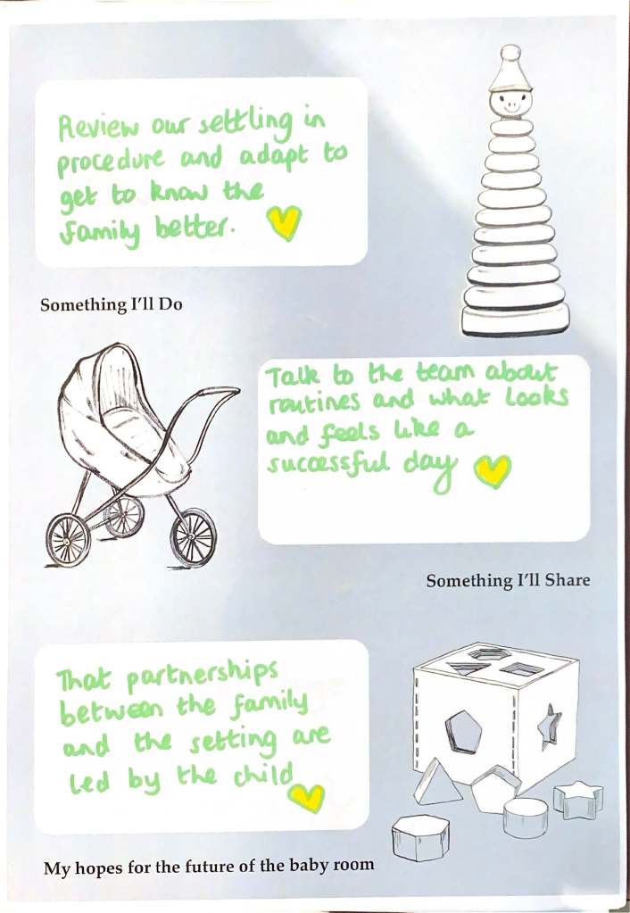 This delegate describes one thing they’ll do based on Debbie Brace’s workshop and one thing they’ll share based on Cassie Holland and Rachel Pirie’s workshop. They wrap up with a vision for the baby room that emulates discussions about children and families across the day.