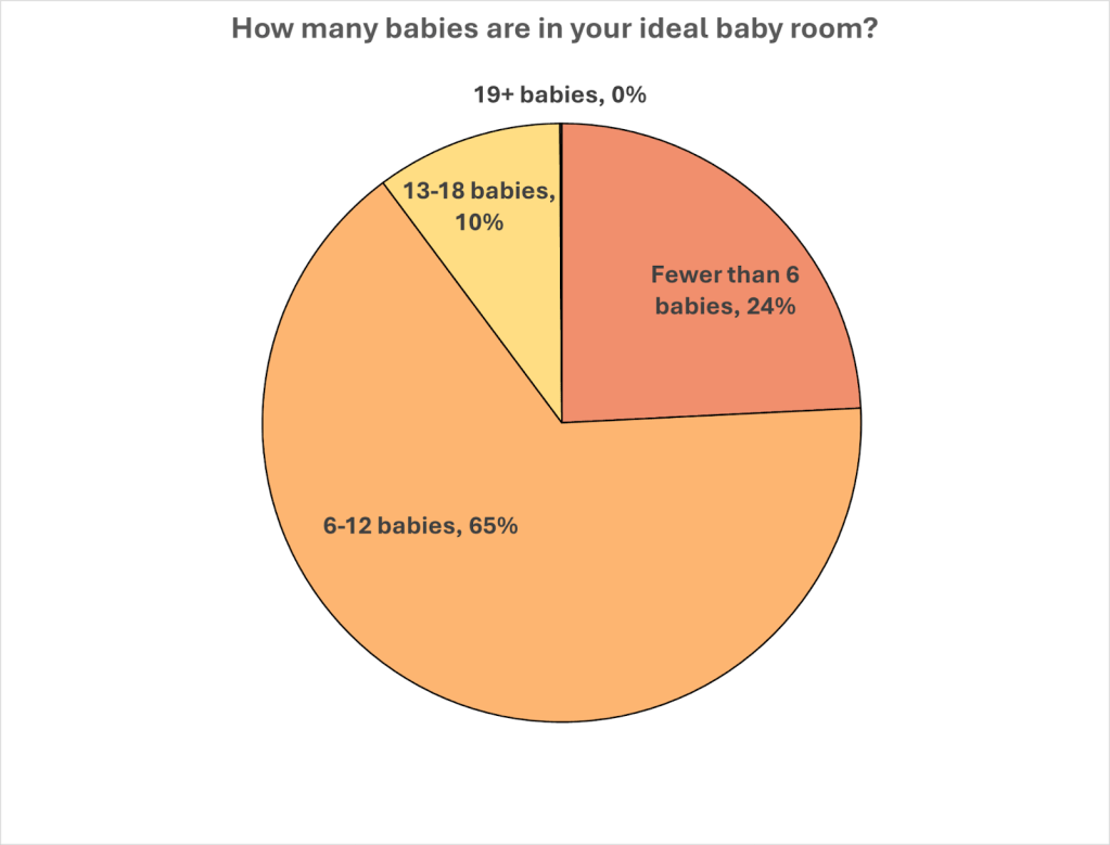 From our conferences, it became clear that baby room educators struggle when they have a large baby room. 65% of participants from the vision-building workshops envisioned between 6 and 12 babies in their ideal baby room (N=78). This tells us that baby room educators want their baby rooms to have a bit of ‘buzz’ (since the majority did not choose to reduce size even further), whilst still remaining calm, manageable spaces for attuned interactions and connection.