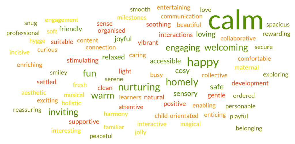 Across our vision-building workshops, participants (N=84) shared that they wanted their baby rooms to feel calm, happy, and homely. The word cloud shows the prevalence of the word ‘calm’ in participants’ responses. This vision helps us connect to what we are striving to offer the babies in our care. Because baby rooms are dynamic spaces, and some days can be challenging, it is important to keep coming back to what we are striving for. This helps us reflect and take small steps towards the ideal of a calm baby room.