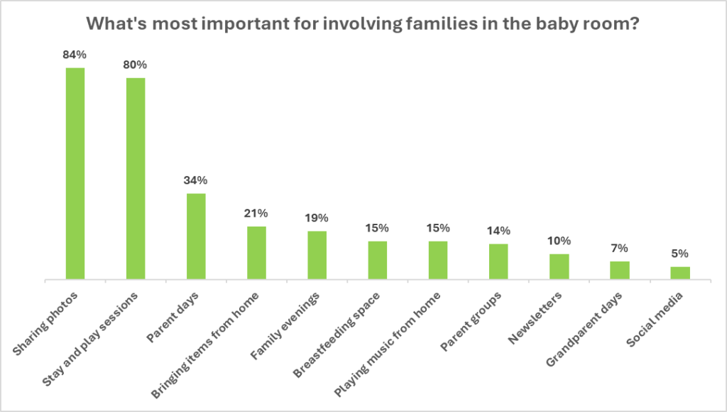Baby room teams felt that sharing photos and holding stay and play sessions were the best ways to involve families in the baby rooms (N=86). When we asked them to tell us more about this vision, participants shared the following: